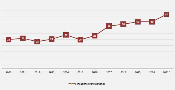 Rośnie również cena jednostkowa sprzedawanych gruntów (w ujęciu rocznym – łączny obrót podzielony przez łączną powierzchnię sprzedanych gruntów), która w roku 2021 osiągnęła poziom ok. 47 zł/m2 i była o 17% większa niż w 2020 roku.